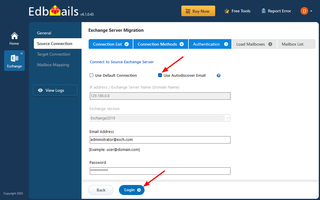 - Choose ‘Use Autodiscover Email’, enter the email address and password, and click the ‘Login’ button to establish the source Exchange connection.