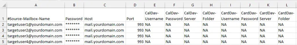 - Open the CSV file and fill in the necessary details, including the email address, password, IMAP server hostname, and port number for each mailbox. After completing the entries, save the file to proceed with the migration.