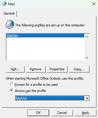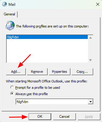 Step 8: Click Apply → OK, then reopen Outlook using the new profile.