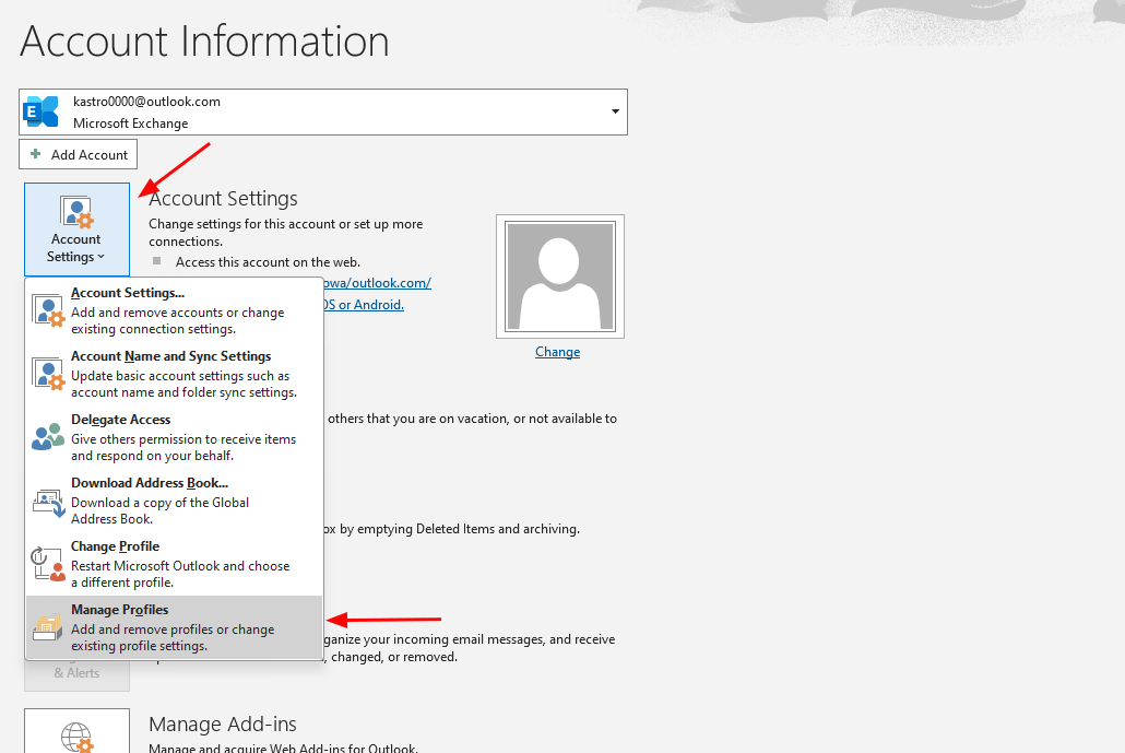Step 3: Open Outlook → go to File → Account Settings → Manage Profiles.