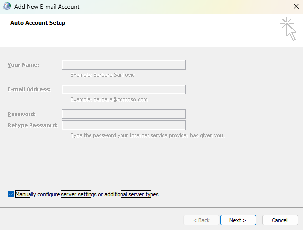 - Choose Manually configure server settings or additional server types if needed for IMAP, POP, or Exchange.
