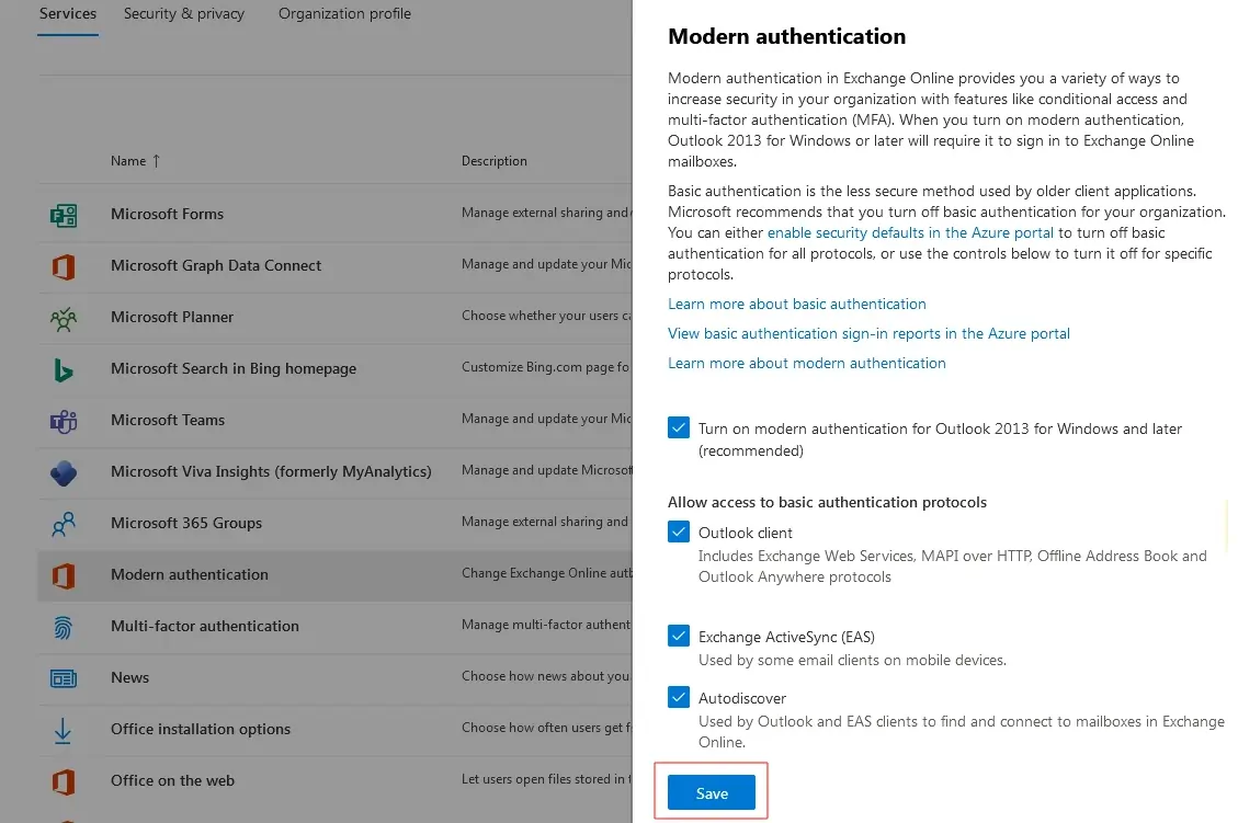 - Step 4: In the Modern authentication section, choose the protocols you want to enable and then click Save to apply the changes.