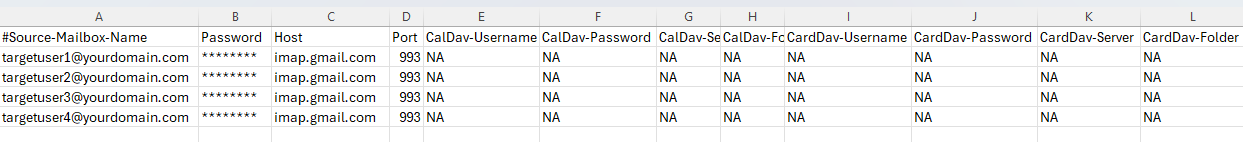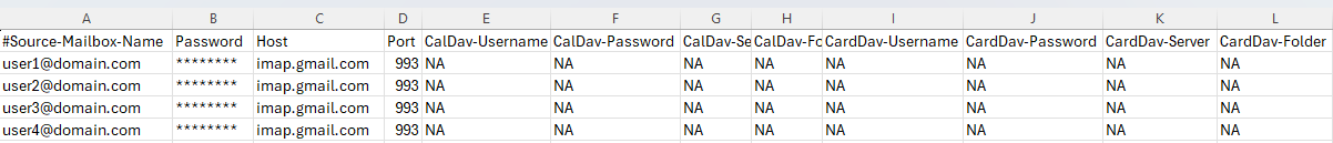 - Open the CSV file and fill in the necessary details including the email address, password, host name, and port number, then save the file once all the information has been updated.