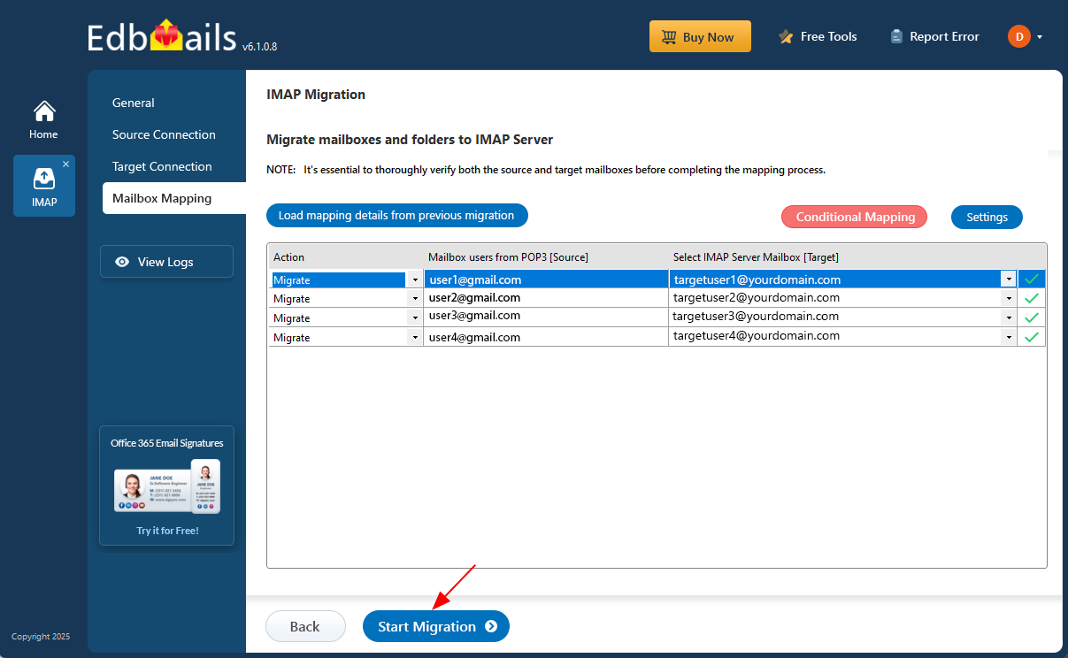 - Verify both the source and target mailboxes before completing the mapping process.