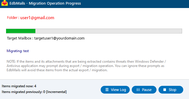 EdbMails provides pause and resume functionality. If a migration is interrupted due to network issues, system shutdown, or throttling, you can restart the migration from where it stopped. The tool performs incremental migration, transferring only the items that were not migrated yet, ensuring no duplicates or data loss.