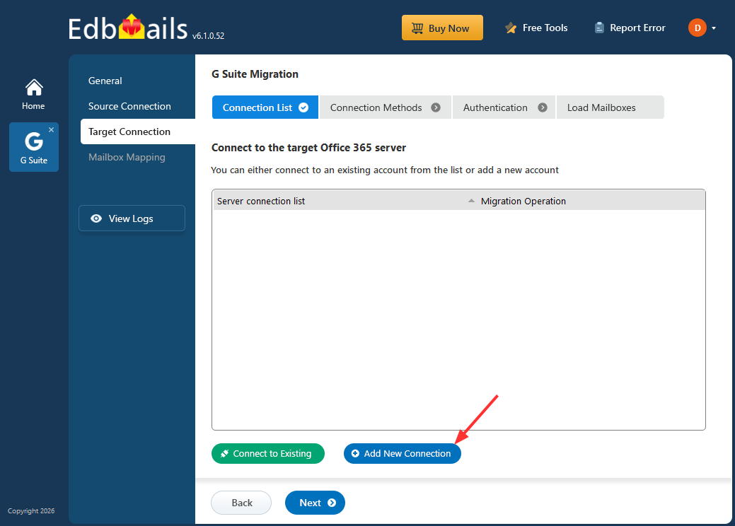 - Click the ‘Add New Connection’ button to establish a new connection to the target Office 365. To use the previous connection, select it from the connection list and click the ‘Connect to Existing’ button to proceed.