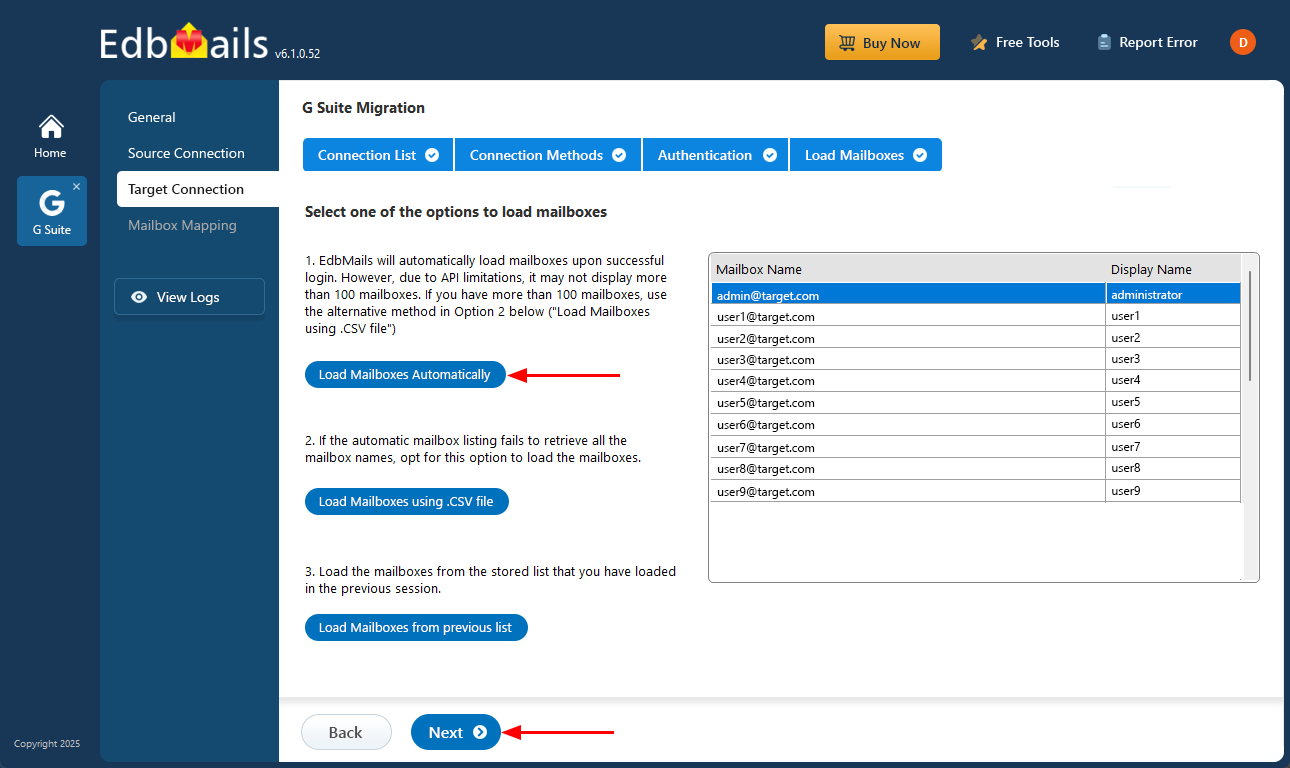 - Select one of the methods to load the mailboxes. You can choose ‘Load Mailboxes Automatically’ or load them using a CSV file, then click Next.