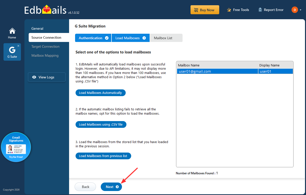- Select one of the methods to load the mailboxes, then click ‘Next’.