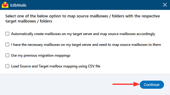- Choose the required mailbox mapping option, then click ‘Continue’.