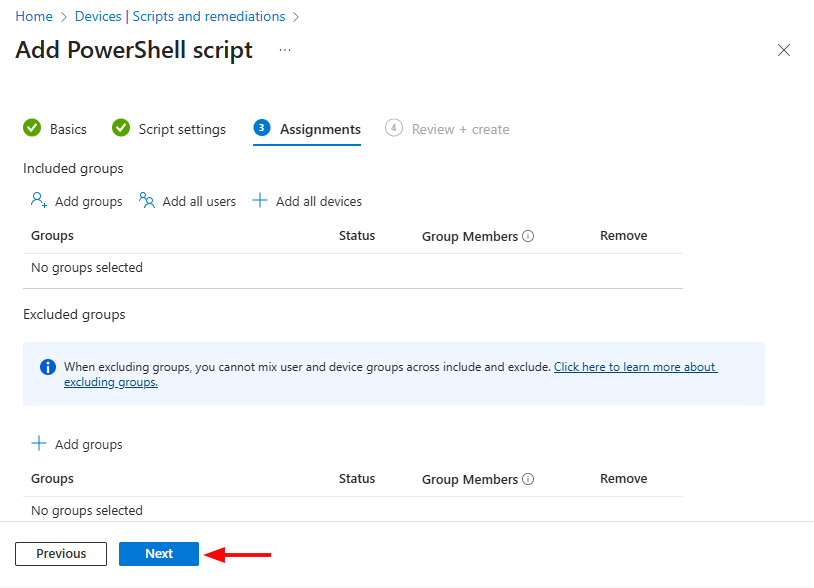 - In the Assignments step, select the users or user groups that should receive the script. If needed, you can exclude specific groups by configuring the Excluded groups section.