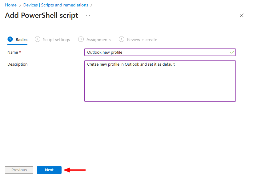 - Assign a name to your script, add an optional description if needed, and then click Next.