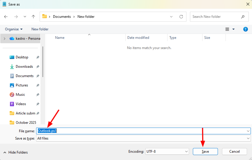 - Choose Save As (Ctrl+Shift+S) and save the file with a .ps1 extension, such as Outlook.ps1.