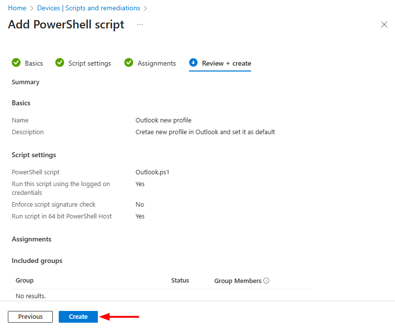 - In the final Review + create step, verify all the script policy settings. Once confirmed, click Create to add the script to your scripts list.