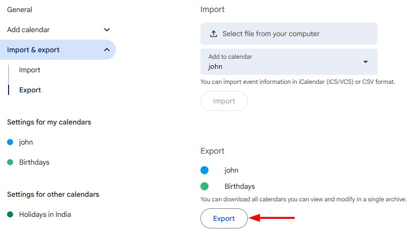 - Under Export, click Export. A ZIP file will be downloaded to your computer, and inside it, you’ll find separate ICS files for each of your calendars.