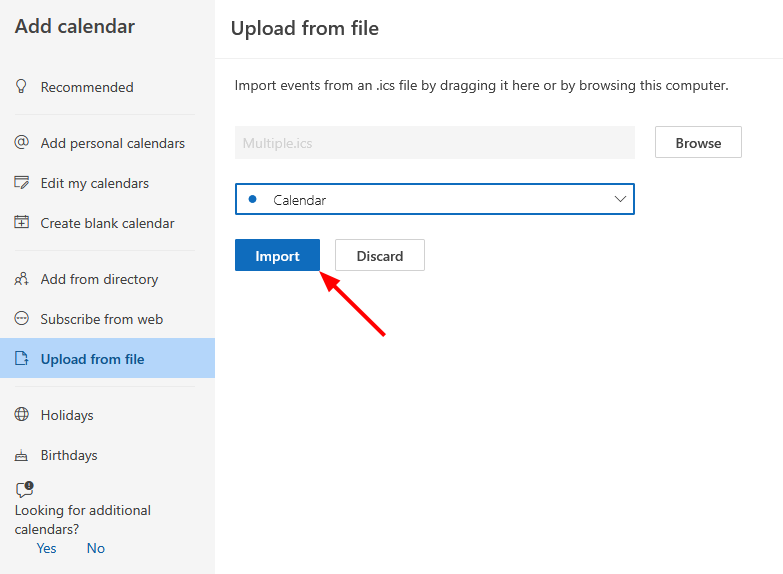- Select the calendar and click the ‘Import’ button.