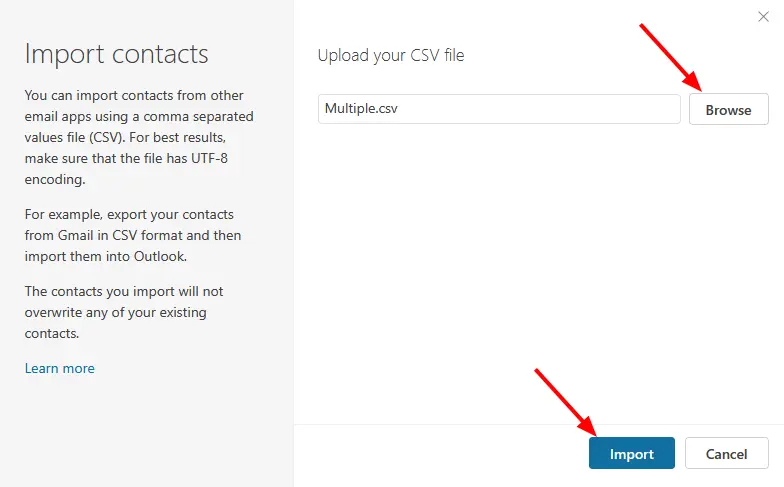 - Click the Browse button to locate and select your CSV file, then click Import, as shown in the image below.