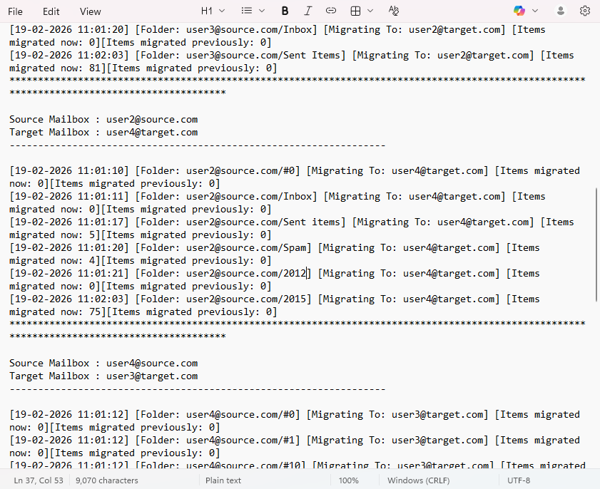 EdbMails Office 365 Migration software automatically generates a detailed, text-based migration log report after each migration operation. The report provides essential information about the process, including the migration status of every mailbox, any errors or warnings encountered, and a detailed count of items migrated in each mailbox and its folders.