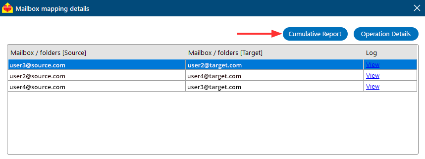 The Cumulative Report option in EdbMails provides a complete and consolidated overview of your entire migration process in a single report. It includes all source and target mailbox details involved in the migration, the total count of migrated items, details of excluded folders, timestamp information for each session, and the number of items migrated in previous sessions. By combining data from multiple mailboxes and sessions into one comprehensive report, this option helps administrators efficiently track overall migration progress and accurately verify the results.